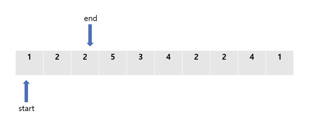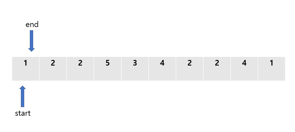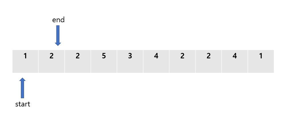 앞서 설명한 것과 마찬가지로, 투 포인터 방식에선 start와 end라는 두 개의 포인터를 정의해준다.