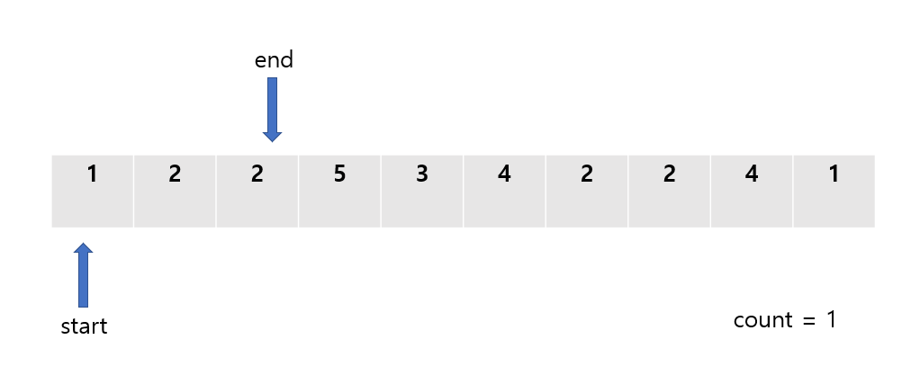 start ~ end의 모든 합은 1이므로, 우리가 찾고자하는 값보다 작다. 그렇다면, end 포인터를 1 증가시켜준다.