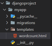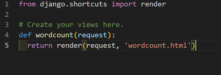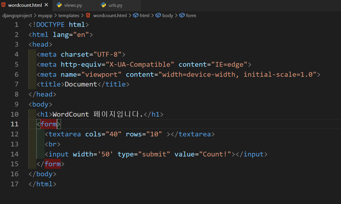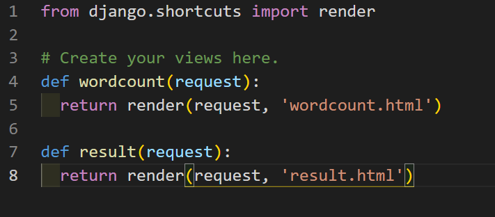 myapp 폴더 안의 views.py에 들어가 함수의 이름, 결과로 띄워줄 html의 이름을 모두 wordcount로 바꾼다.