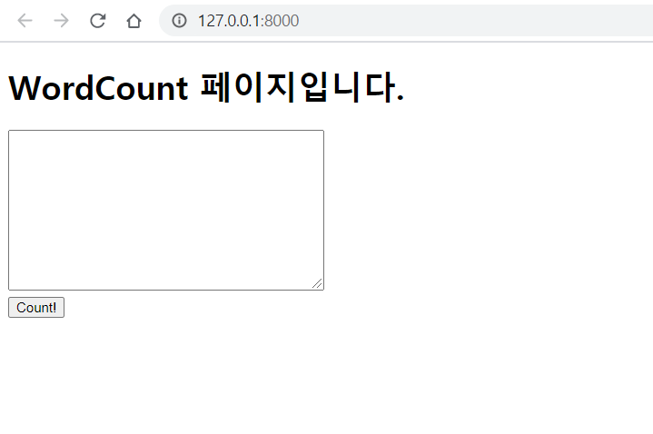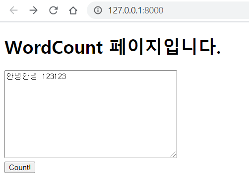 다시 터미널에서 python manage.py runserver를 실행시켜주고, wordcount 페이지가 뜨면 textarea에 아무 값이나 입력하고 제출버튼을 눌러보자.