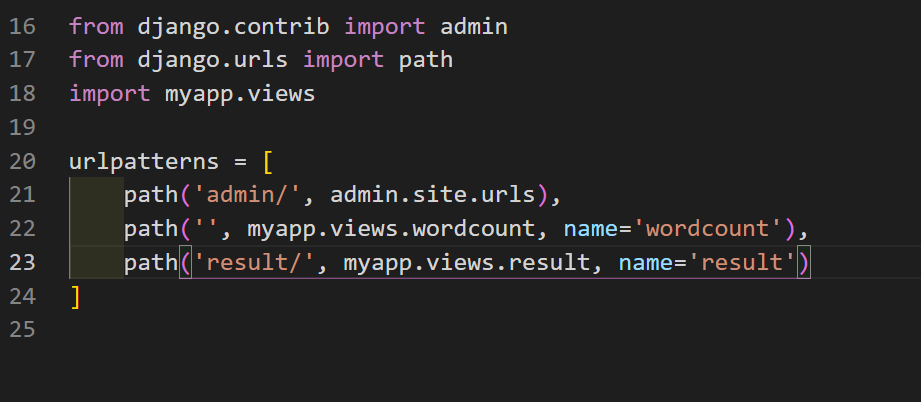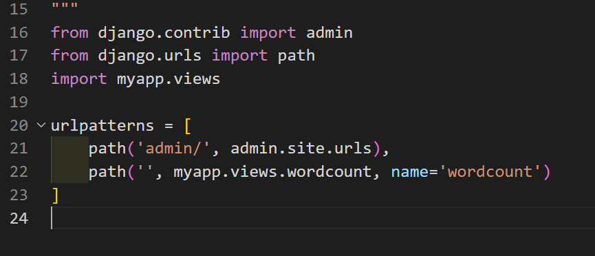 마지막으로 사이트의 주소를 정의해주었던 myproject 폴더의 urls.py에서도 함수 이름과 url 이름을 wordcount로 바꿔준다.