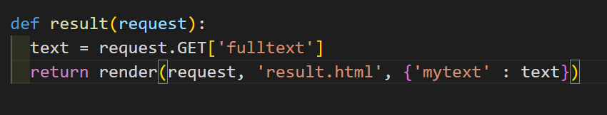 다시 말해, wordcount 페이지에서 form 태그를 통해 넘어온 request.GET['fulltext'] 데이터를 'mytext'라는 이름의 변수에 담아 result.html로 넘겨주겠다는 것으로 해석하면 된다.