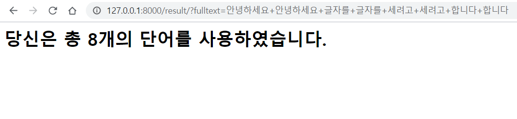 지금까지 wordcount 페이지에서 form 태그로 값을 입력받고, 해당 값을 result 페이지로 옮겨가는 과정까지 완료했다.